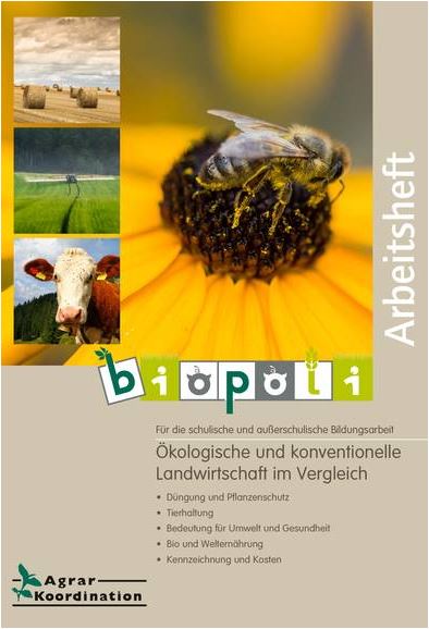 Das Biopoli-Arbeitsheft „Ökologische und konventionelle Landwirtschaft im Vergleich“ richtet sich an Lehrerinnen und Lehrer der Sekundarstufe 1 und 2, die mit ihren Schülern Themen rund um das Thema nachhaltige LAndwirtschaft. Es geht unter anderen um Düngung und Pflanzenschutz, Tierhaltung, die Bedeutung für Umwelt und Gesundheit, Bio und Welternährung sowie Kennzeichnung und Kosten.