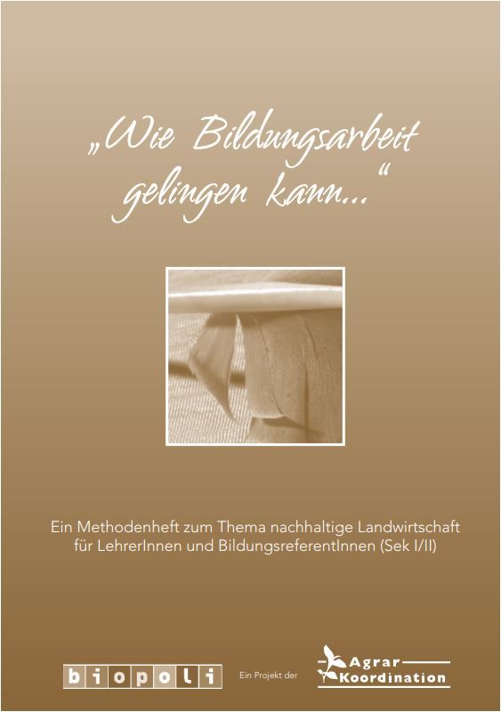 Diese Methodenmappe profitiert von den Erfahrungen der fast zehnjährigen Bildungsarbeit der BIOPOLI-Referenten der Agrar Koordination – ihre Erfahrungen und Methodenvorschläge werden in der Mappe in einer etwas persönlicheren Form vorgestellt. Herausgekommen ist eine bunte Mischung an Methoden zum Thema Nachhaltige Landwirtschaft, die erprobt und geeignet sind, gute Bildungsveranstaltungen zu machen.