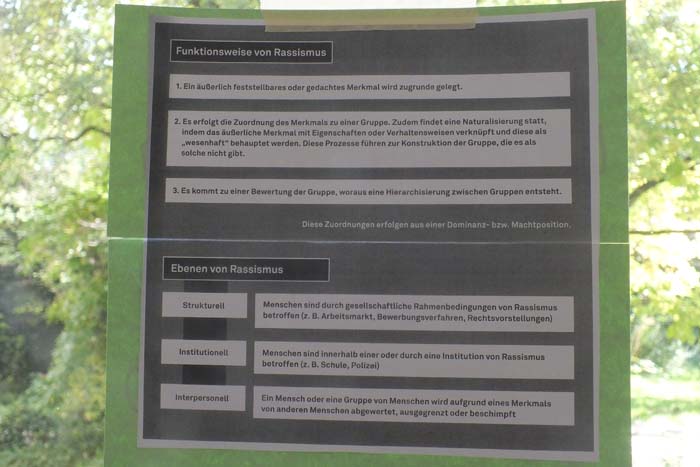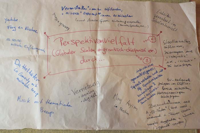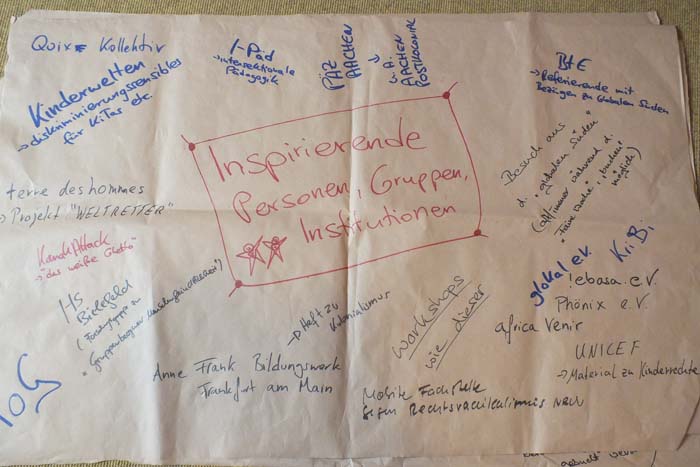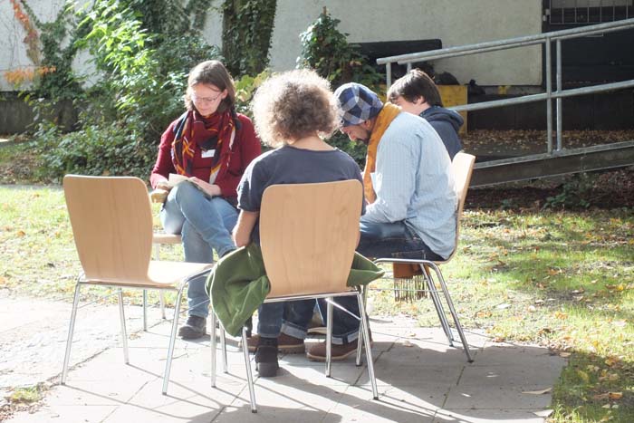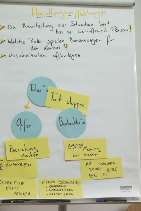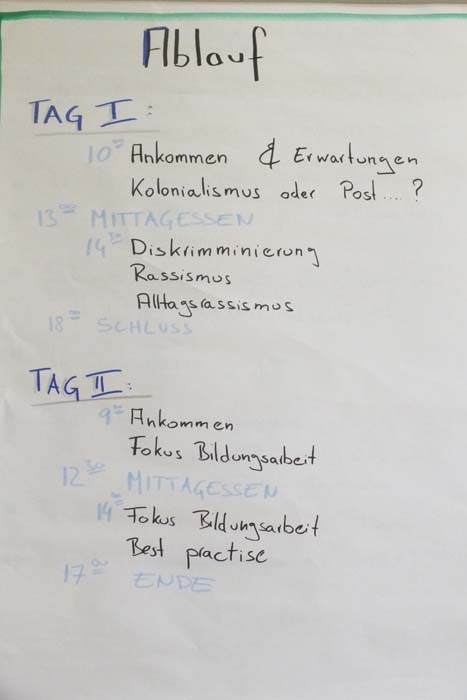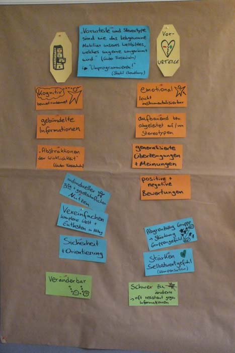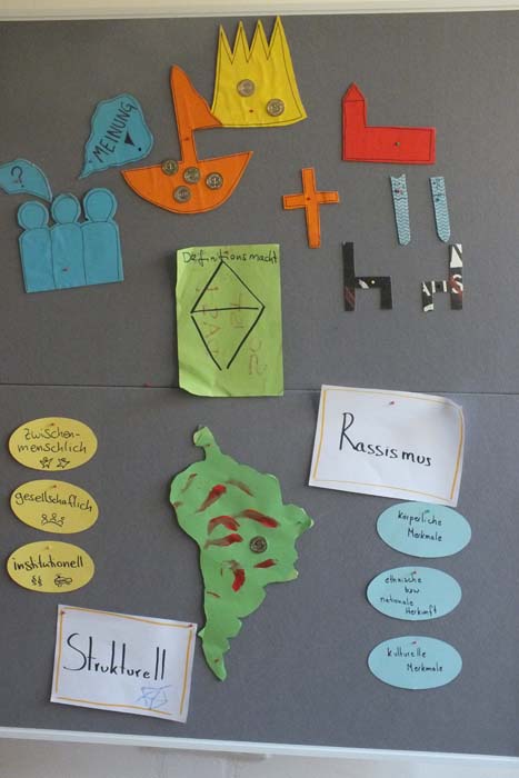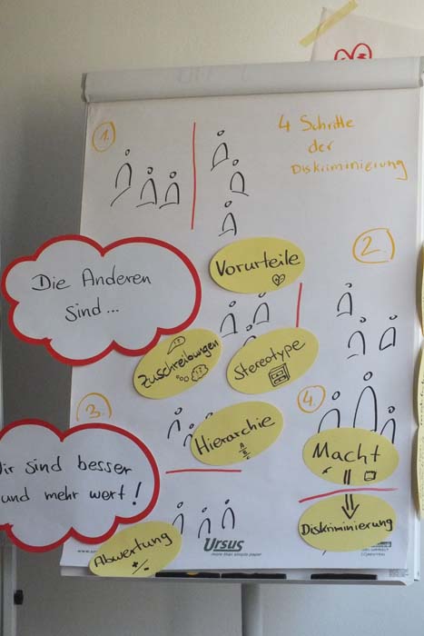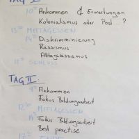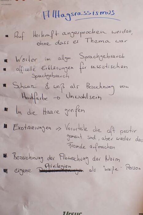 In der zweitägigen Schulung haben wir uns zunächst mit den Begriffen „Rassismus“ und „Stereotypen“ auseinandergesetzt. Außerdem beschäftigten wir uns mit der Frage, wie wir als Aktive in der Bildungsarbeit diese Themen aufgreifen und handhaben können. Da wir rassistische Bilder gesellschaftlich erlernen und sie (unbewusst) weitertragen, waren Selbsterfahrung und Selbstreflexion ein wichtiger Bestandteil des Wochenendes.