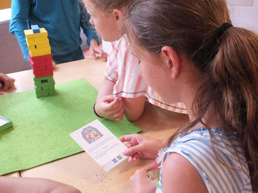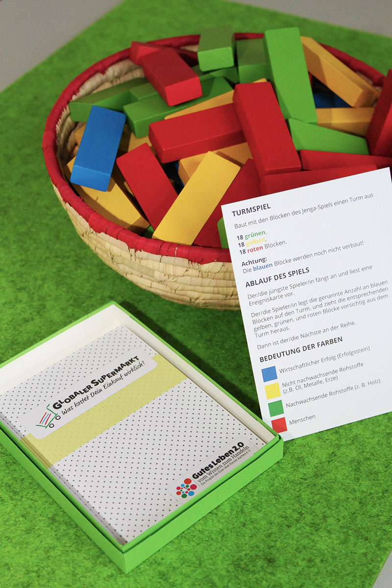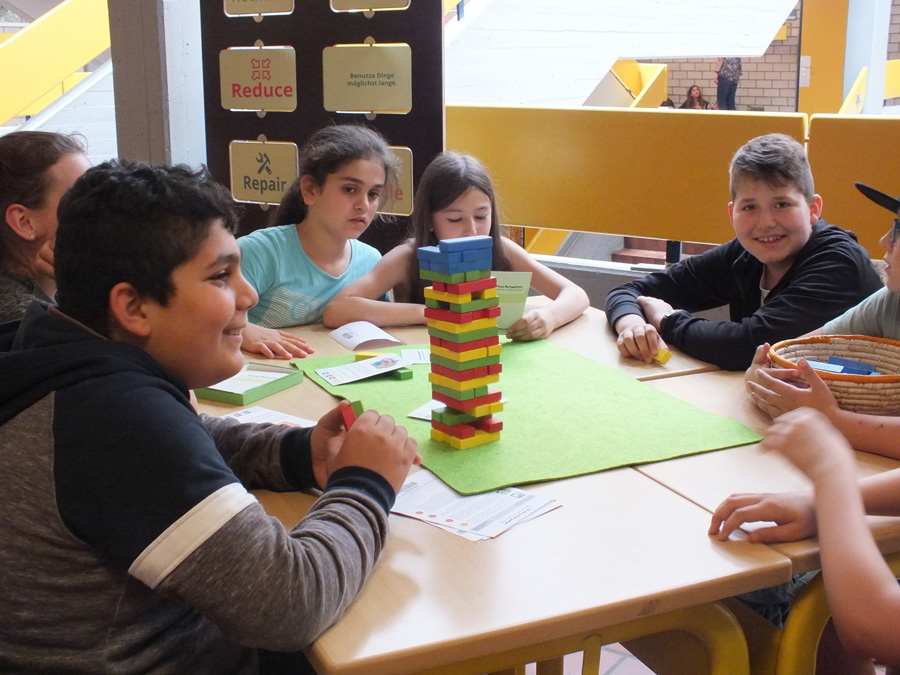 An einer anderen Station bauen die Kinder und Jugendlichen einen Konsumturm und erkennen, dass Konsum auf natürlichen Ressourcen basiert und dass diese endlich sind. Gleichzeitig geben Handlungsalternativen, wie Tauschen –Teilen – Leihen erste Einblicke in eine Welt jenseits von Konsumsteigerung.