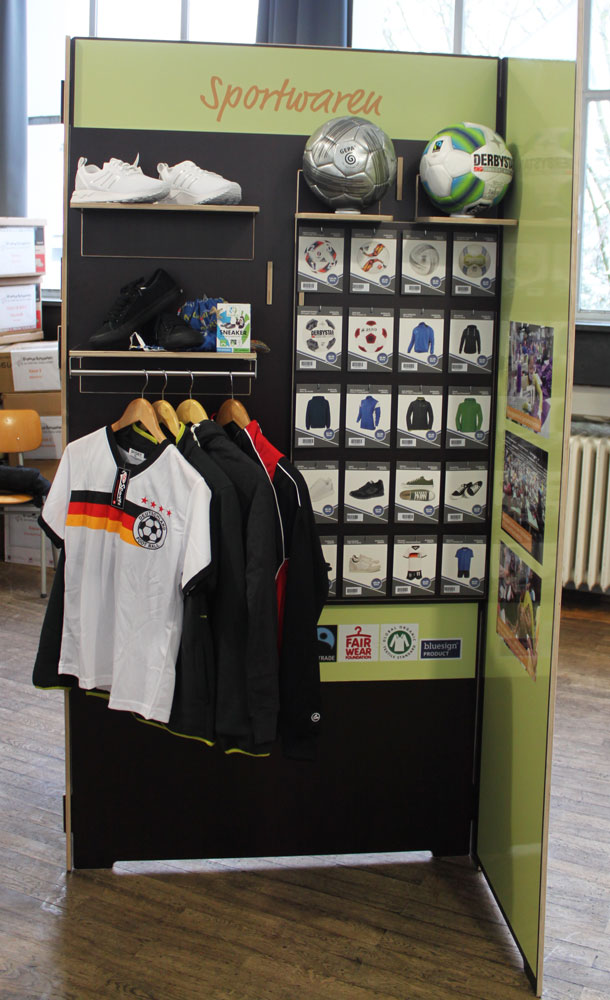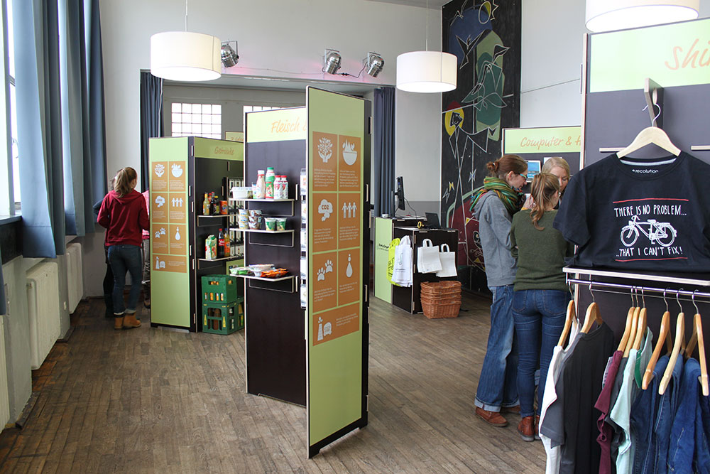 Handy, Jeans, Sportschuhe, Trinkjoghurt oder Schokoriegel – aus insgesamt 150 Produkten können die Kinder und Jugendlichen auswählen. Am Ende erhalten sie an der Kasse die „Quittung“ für ihren Einkauf. Hier erfahren sie, wie viel an Rohstoffen, Wasser und Fläche bei der Herstellung des ausgewählten Produktes gebraucht wurde, wie viel CO2 dafür ausgestoßen wurde und welchen Einfluss dies auf die Lebensbedingungen von den Menschen hat, die an der Herstellung des Produktes beteiligt waren.