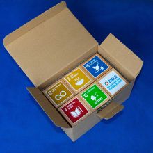 Die 17 SDGs als Klötze für die Bildungsarbeit inkl. einer didaktischen Handreichung in einem Karton Verpackt.